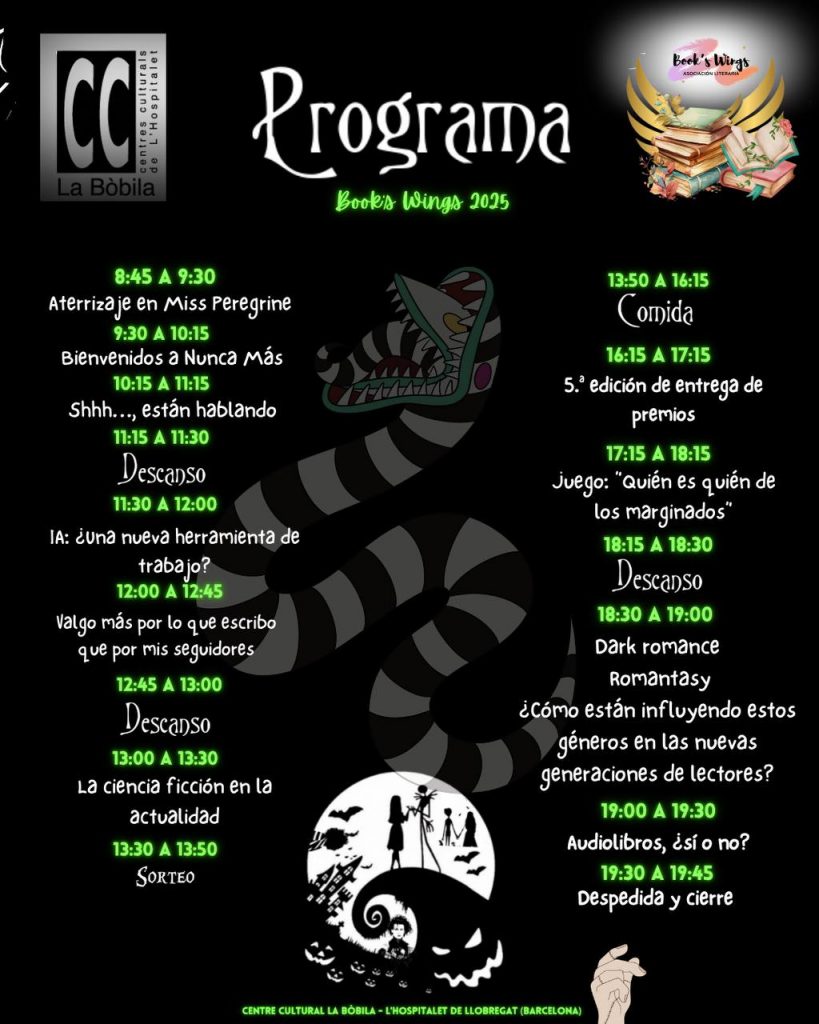 El pasado 8 de noviembre, el Centre Cultural La Bòbila de L’Hospitalet de Llobregat se transformó en un escenario digno del universo de Tim Burton para celebrar el 5º aniversario de Book’s Wings, un evento literario que reunió a autores, lectores y amantes de las letras bajo un mismo lema, disfrutar de la literatura con el corazón.