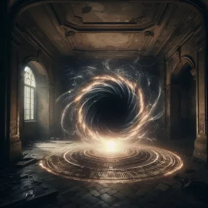 Un portal oscuro, como un vórtice de sombras y luces intermitentes, comienza a abrirse en el centro del círculo. Su superficie es turbulenta, girando con una energía caótica que parece desdibujar la realidad misma. El grupo se siente desorientado, como si estuvieran en el borde de un abismo desconocido. El sonido que emite el portal es ensordecedor, un canto lejano que se mezcla con sus propios latidos.