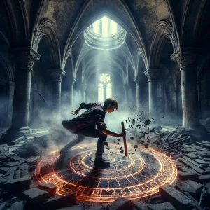 Leo busca entre los escombros y encuentra una vieja barra de hierro oxidada, cubierta de tierra y telarañas. Con una mirada decidida, levanta la barra y, al ritmo de la respiración entrecortada del grupo, comienza a golpear los símbolos en el suelo. Cada impacto reverbera en el aire como un eco de advertencia, y el círculo comienza a desmoronarse.