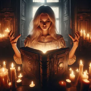 Conforme el ritual avanza, las velas parpadean erráticamente, proyectando sombras que no corresponden con los movimientos de la llama. Esas sombras empiezan a tomar forma, contorsionándose en figuras humanoides que parecen observar desde las esquinas de la habitación, sus rostros indistinguibles, pero claramente mirando. Ethan da un paso atrás, inquieto. Las sombras no son normales.