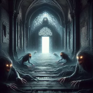 A medida que descienden, el ambiente cambia; murmullos inquietantes llenan el aire, un eco distante de risas macabras que parecen burlarse de su decisión. De repente, una serie de criaturas grotescas emergen de las sombras: seres deformes con ojos brillantes y garras afiladas, guardianes del pasadizo que protege la salida.