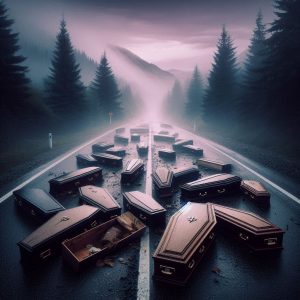 Alrededor del camión, velados por la niebla, se esparcían los ataúdes que habían caído fuera de la caja de carga. Habría una treintena.