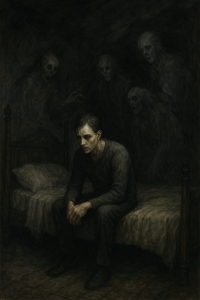 Una vez volví en mí, pude comprobar que ya nada había a mi alrededor, volvía a estar solo en aquella vieja y gélida mansión, donde el calor del amor dejó de existir hace años. Ahora, tan solo me acompañaba mi buena y fiel amiga soledad, y quizás el odio. Me levanté del suelo ayudándome de mis manos, y proseguí mi camino hasta mi habitación. Necesitaba tumbarme en la cama y descansar; probablemente aquello era lo que necesitaba mi mente cansada. Una vez dentro de la cama me tapé por completo, quedando completamente a oscuras, donde tan solo el suave tintineo de las estrellas que dibujaban el cielo nocturno, y el brillo de una luna en su fase cuarto menguante lanzaban algo de luz sobre la estancia. Cerré los ojos esperando a que el sueño viniese a mí, pero todo volvió a suceder de repente. Los susurros resonaron una vez más en mis oídos, pero ahora aún más cerca, como si hubiese alguien allí, tumbado a mi costado. Decidí pues abrir los ojos y lanzar una mirada furtiva, pero no logré ver nada, ninguna figura. El corazón comenzó a latir cada vez más y más rápido, pero sobre todo cuando pude vislumbrar al fondo de la habitación como una larga sombra se asomaba por detrás de la puerta. Intenté gritar, pero no pude; mi voz parecía morir dentro de mí, ahogándose con mi valor hasta desaparecer por completo. Alcé la cabeza intentando observar con más detalle lo que allí había, pero ahora pude presenciar como el ventanal se iba alejando cada vez más, como si de pronto la habitación comenzase a expandirse, alejándome de todo, quedando quizás a solas en ese pequeño rincón junto a la cama.