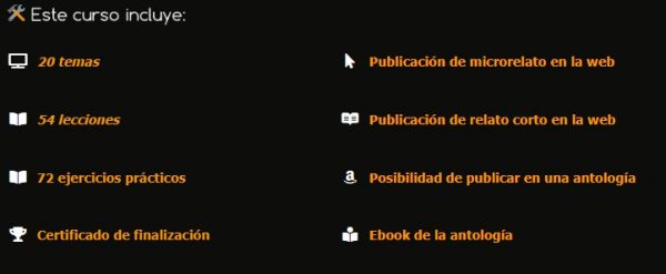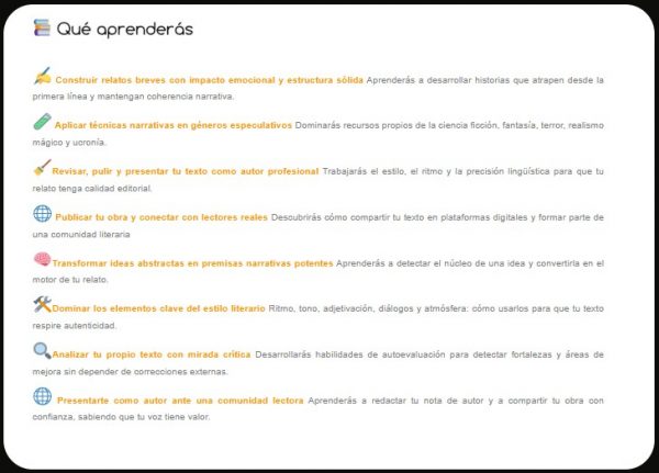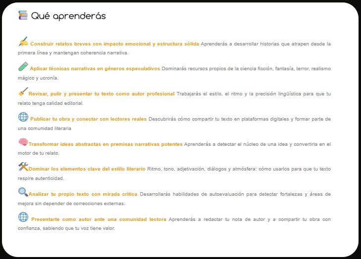 - Curso de Escritura Creativa en Ficción Especulativa Un programa completo de ocho módulos que te guía paso a paso en la creación de universos narrativos. Aprende a diseñar sistemas de magia y tecnología, construir personajes memorables y dominar los géneros de fantasía, ciencia ficción y terror. Culmina con un proyecto final que podrás publicar en .